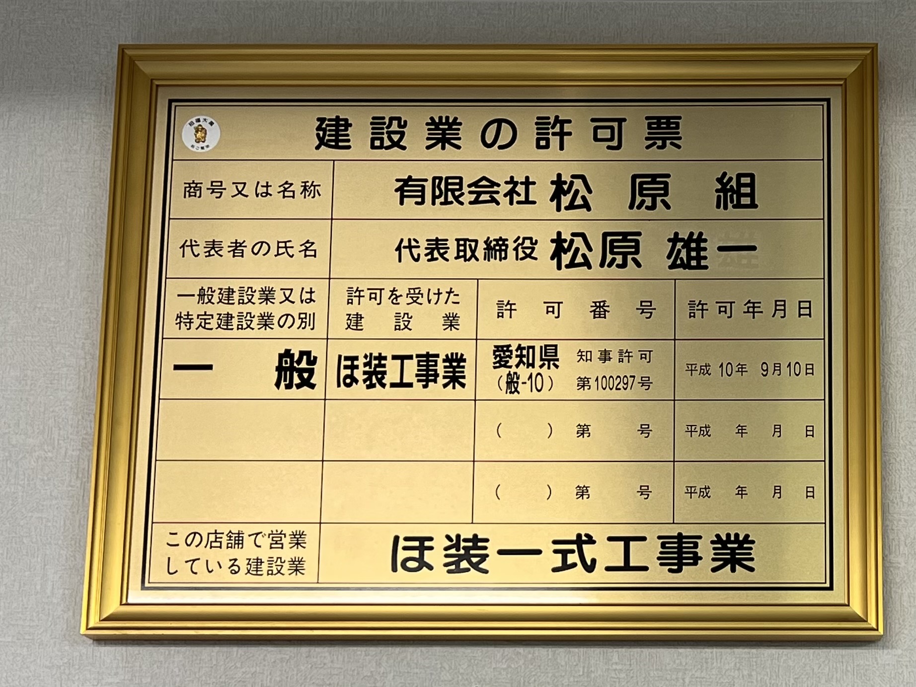 | 建設業許可 | 愛知県知事許可(般-10) 第100297号 |